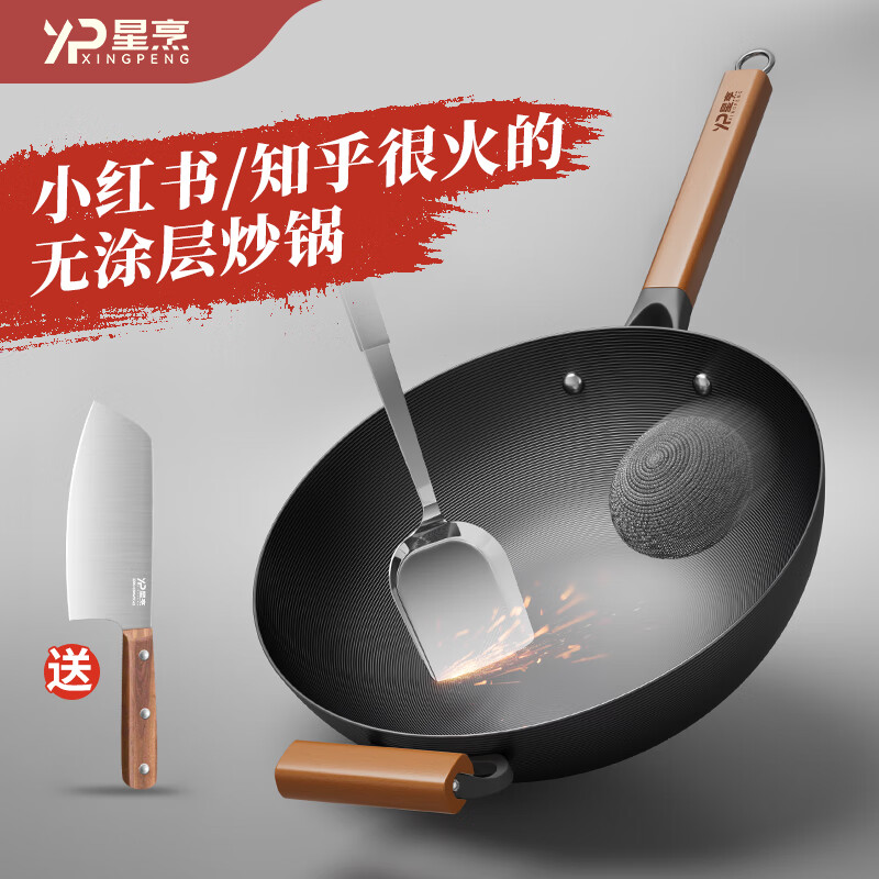 星烹XP无涂层不粘锅氮化精铁炒锅燃气电磁炉平底家用炒菜专用炒锅铁锅 升级三重防粘(无耳) 32cm